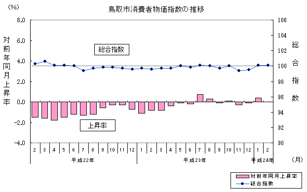 平成24年2月の鳥取市の消費者物価指数は、総合で100.1(平成22年=100)となり、前月比は同水準、前年同月比は0.5%の上昇となった。