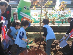 園児たちは、木が大きくなったら、友達と一緒にドングリの実を集めたり、ドングリを使って工作などに使ったりと、たくさんの楽しいことを想像しながら植樹をしました。