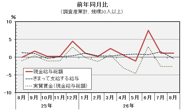 8月の現金給与総額は、規模5人以上で243,436円となった。その名目賃金指数は93.0で前年に比べ5.1%上昇(うち規模30人以上では258,270円、その名目賃金指数88.8で前年に比べ1.1%上昇)となった。またその実質賃金指数は88.7で前年に比べ1.1%上昇(うち規模30人以上では84.7で前年に比べ2.6%低下)となった。