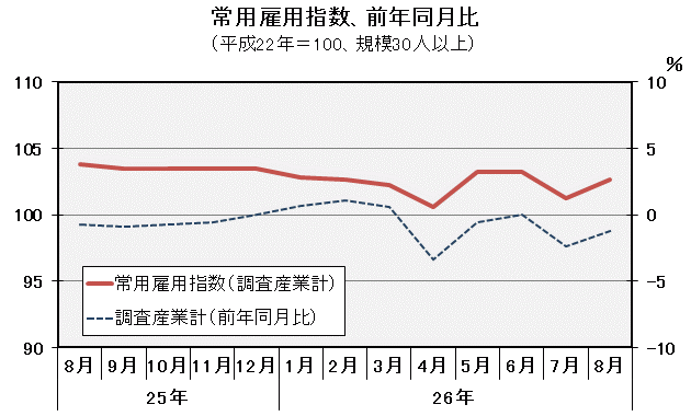 8月末の常用労働者数は規模5人以上で181,079人となった。その常用雇用指数は108.2で前年に比べ0.2%低下(うち規模30人以上では91,820人、常用雇用指数102.6と前年に比べ1.2%低下)であった。
