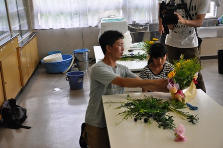 最初に講師の佐野さんから、吸水スポンジの吸水方法、花の切り方や挿し方など、基本の話を丁寧に教えてもらいました。