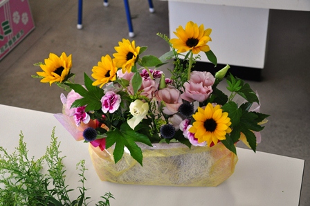 今回は、ヒマワリ、トルコギキョウなどの花材を使ってアレンジメントを作りました。