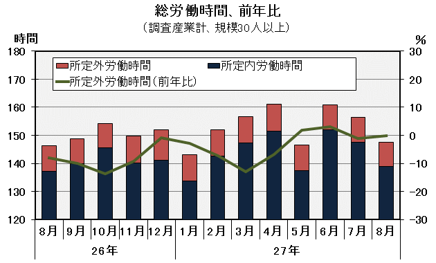 8月の総労働時間は、規模5人以上で147.9時間となった。その労働時間指数98.2で前年に比べ2.0%増(うち規模30人以上では147.6時間、その労働時間指数96.2で前年に比べ0.7%増)となった。