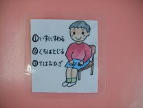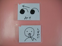集団での話しを聞く時やいすに座る時のお約束ツールです。分りやすいイラストで示し、今することを伝えます。 |