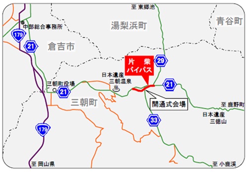 県道鳥取鹿野倉吉線のうち、東伯郡三朝町片柴から砂原間(1.44km)の片柴バイパスを下記のとおり供用開始しました。