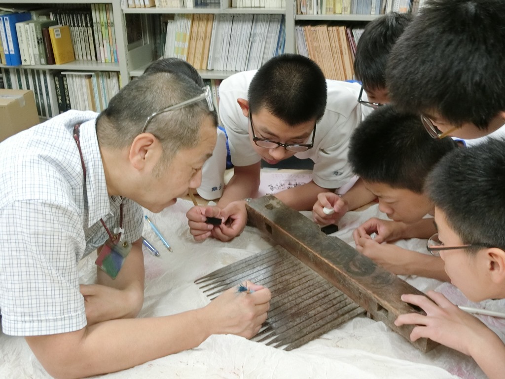 ブラシや消しゴムを使って民俗資料「千歯扱き(稲扱き)」をクリーニングしました。