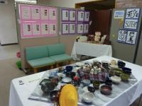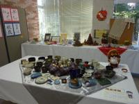 入口では、帽子・手袋・マフラーを身につけ冬の準備ばっちりのハートフル・マスコットキャラクター「きくリン」が来場者をお出迎えしています。4月からの体験活動の時間でできあがった作品、日々の活動時間や家庭でこつこつ仕上げた作品、まなびの森学園や教育センター内のスタッフ・関係者の作品がたくさん展示されています。今回もこのように多くの方々のご協力で、にぎやかな作品展が開催できることに感謝しています。最近できあがった陶芸作品、書道など、多様な造形や色合い、個性あふれるオリジナル作品が訪れた人たちの目を楽しませています。「あの時の作品だよね」「できあがると器の色合いが変化していた」「手先が器用でないとできない作品だね」「どうやったらこんな上手な作品ができるのかな?」など、それぞれの作品の良さを認め合いながら、来場者の話が弾んでいます。