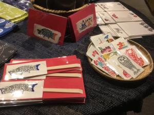型染めのストールやトートバッグ、パペットなどの布小物、便箋・ポチ袋などの和紙製品などを製作しています。