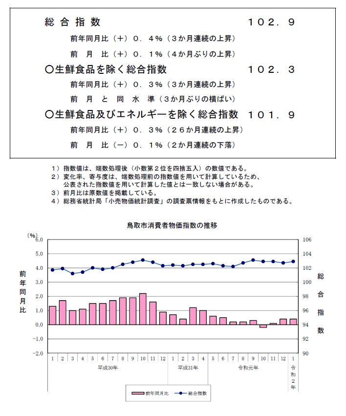 令和2年1月の鳥取市の消費者物価指数は、総合で102.9(2015年=100)となり、前年同月比は0.4%の上昇、前月比は0.1%の上昇となった。
