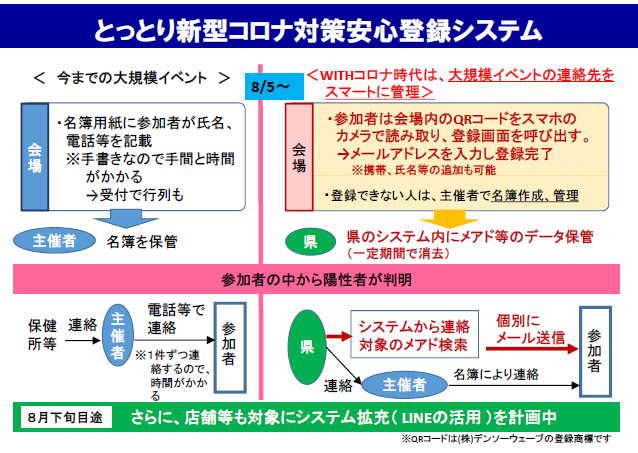 また、本日[8月5日]から鳥取新型コロナ対策安心登録システム、これを開設をさせていただきたいと思います。これは県庁職員の手作りでまずスタートをさせていただこうとしております。これはQRコードがございます。このQRコードを県のほうで発行しまして、イベントといったような場面、そうした所でそれを付与する。参加される方がそのQRコードを読み取られましてメールアドレス、あるいは場合によっては氏名、住所ということも書けるようにさせていただいて、何か感染ということが広がってきた場合には、それがお伝えできるということにしようというものであります。これによりまして実は、QRコード読み取っていただくということで参集者というものが登録をされます。