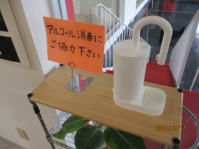出入口にはアルコール消毒液を置いて、手指の消毒をお願いしています。