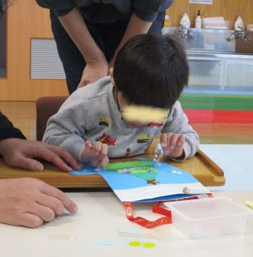 左右に目を動かしながら2つの絵を見比べて…どこが違うのかを説明する、難しいときには「ヒントください」と依頼するなど、自分の言葉で伝える経験を重ね「あっていま~す!!」と認め合いながらみんなで楽しんでいます。回数を重ねるごとに内容も難しくなっていきますが、その分見つけた時の喜びは大きく言葉の説明も上手になっています。