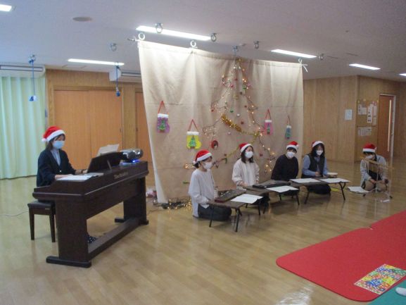 クリスマスパーティーの始まりは、職員が「♪サンタが街にやってくる」の曲で合奏!!