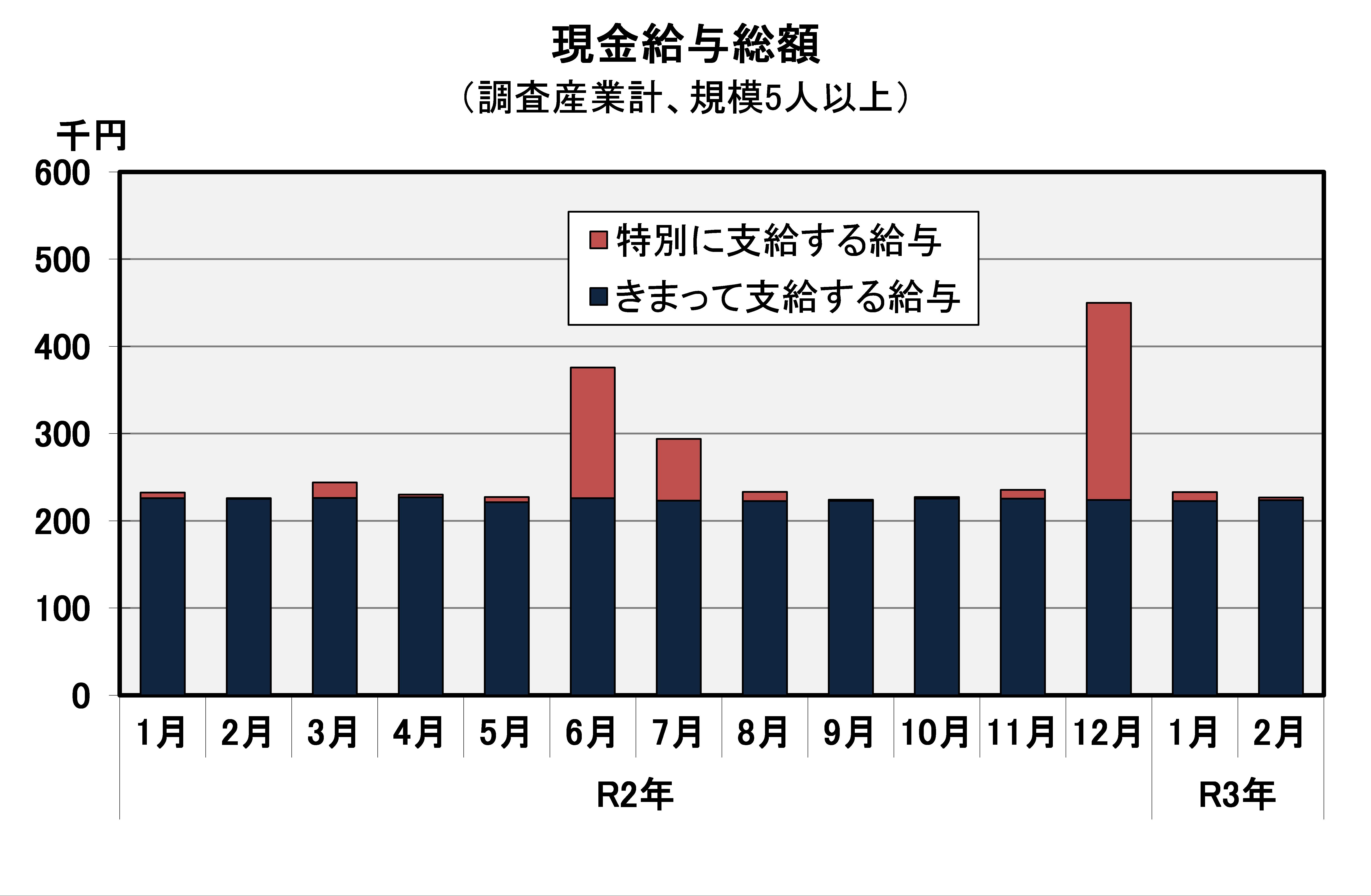 2月の現金給与総額は、規模5人以上で226,719円となった。その名目賃金指数は80.3で前年に比べ0.4%増(うち規模30人以上では245,079円、その名目賃金指数は78.9で前年に比べ0.5%増)となった。また、その実質賃金指数は78.3で前年に比べ0.9%増(うち規模30人以上では77.0で前年に比べ1.2%増)となった。