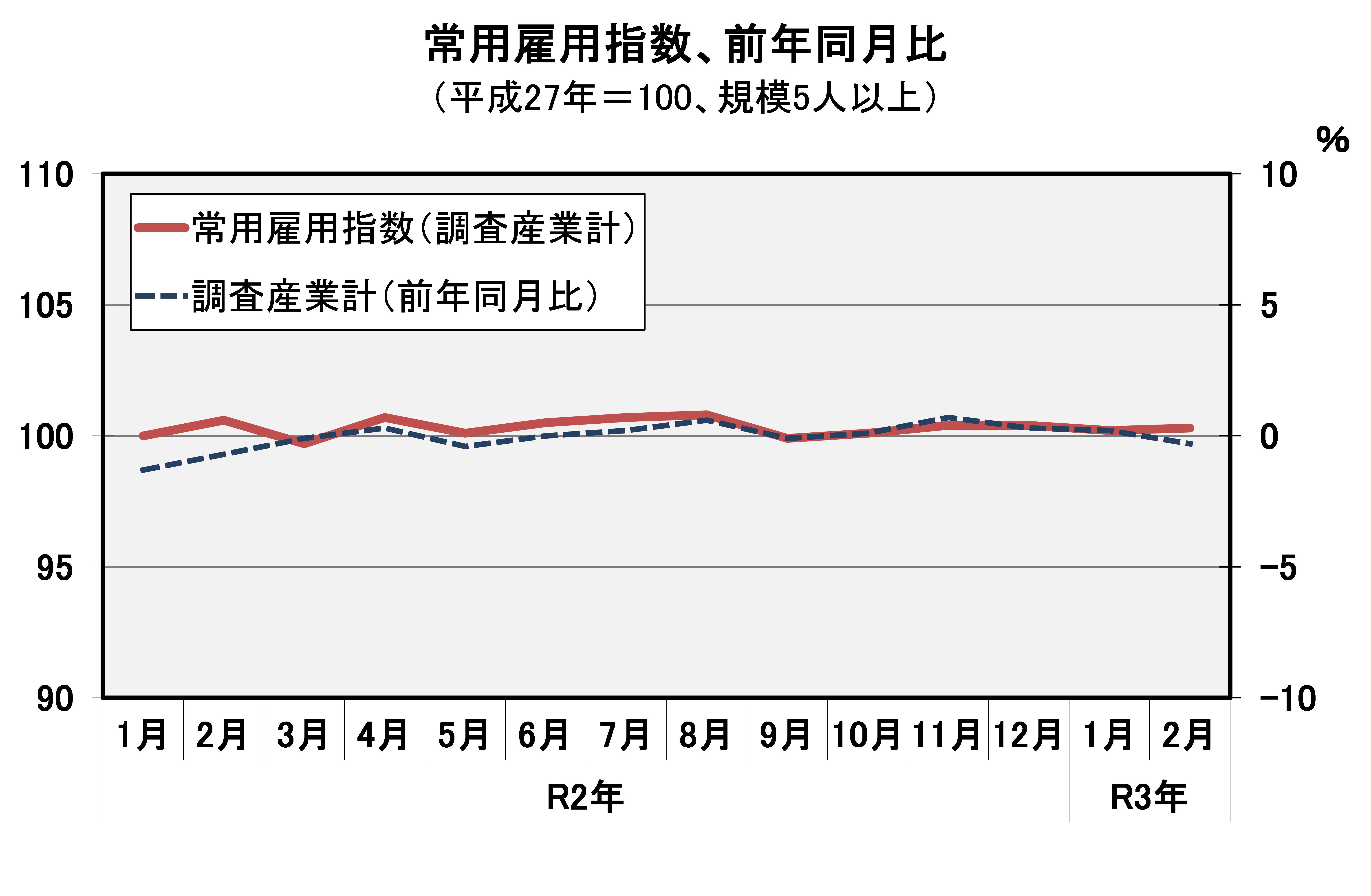 2月末の常用労働者数は規模5人以上で179,553人となった。その常用雇用指数は100.3で前年に比べ0.3%減(うち規模30人以上では94,243人、常用雇用指数は100.2で前年に比べ0.6%減)となった。