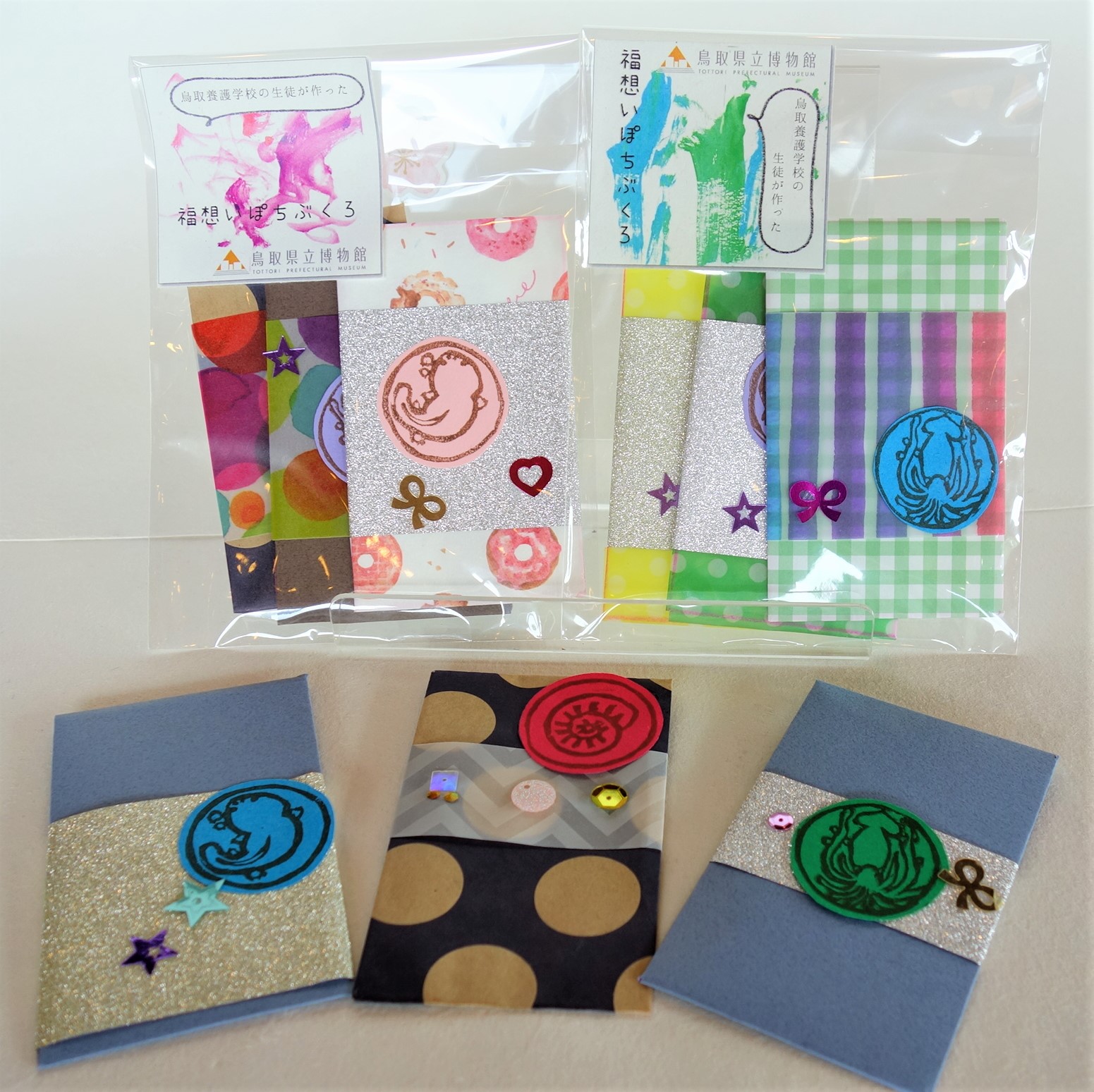 ※縦10cm×横6cm 鳥取養護学校高等部生活コースの学生の皆さんが作業学習で商品開発してくださいました。 当館を見学し、実際に学ばれたことを学芸員の指導のもと、グッズデザインに取り入れ制作。 アンモナイト・ダイオウイカ・オオサンショウウオの3つをデザインし、そのモチーフを消しゴムに彫り、消しゴムハンコにして、ぽち袋の帯に使用しています。さまざまな工夫をし使う人のことを想いながら丁寧に仕上げられています。 〈鳥取養護学校高等部生活コース 制作〉