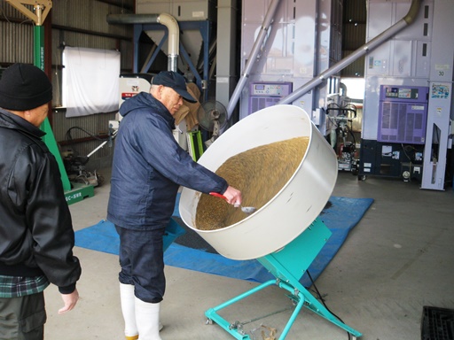 伯耆町遠藤地区にある集落営農法人(農)伯耆の郷(ほうきのさと)で試作されている、水稲鉄コーティング「きぬむすめ」のコーティング風景です。平成27年度は二筆で試作されました。(計50a)今のところ順調に生育しています。