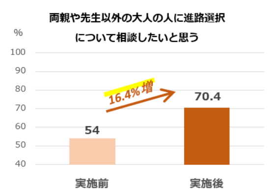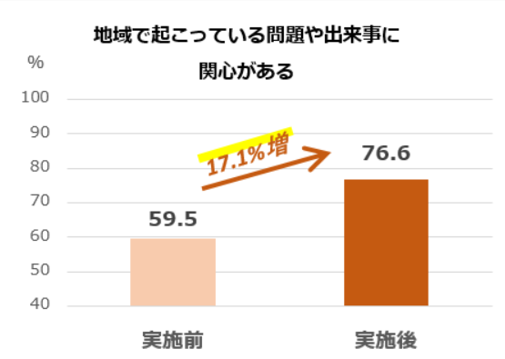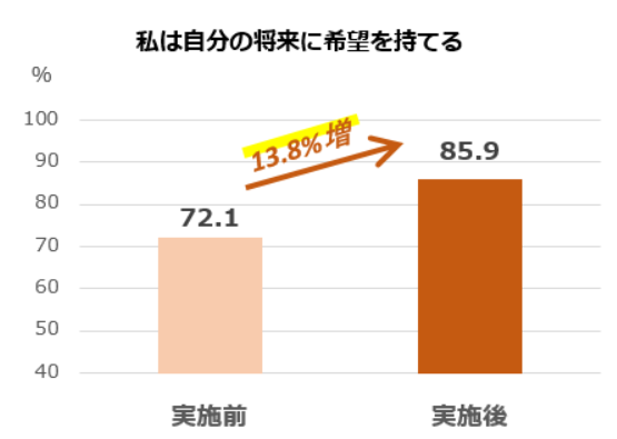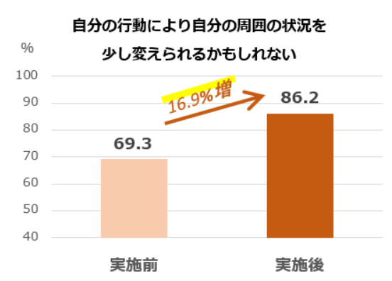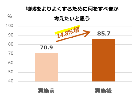 中学生へのアンケートで自己肯定感や、地域への貢献意識等について尋ねたところ、プログラム実施後の肯定的回答が実施前を上回りました。