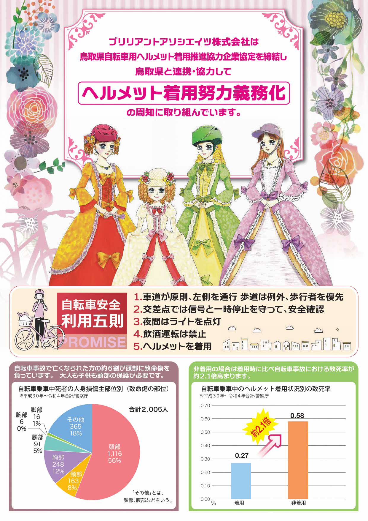 協定締結後に、同社キャラクター「華貴婦人」を使用した「自転車用ヘルメット着用啓発チラシ」を作成しており、同社が運営するカフェ・レストラン等で、来客者の方にも配布予定です。