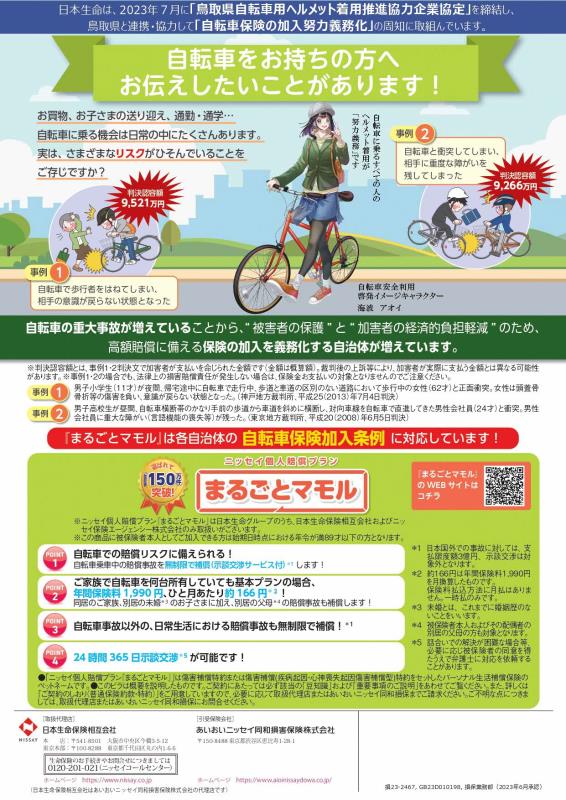 日本生命保険相互会社鳥取支社は、協定締結後、従業員に対するヘルメット着用推進啓発活動はもちろんのこと、県民の方々に対し、鳥取県支え愛交通安全条例で努力義務として定められている自転車損害賠償保険等の加入促進にも取り組んでいただいています。
