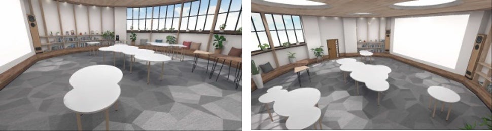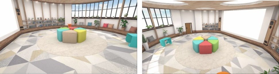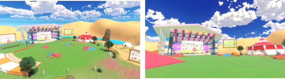 動画を流すためのメインスクリーンをはじめ、情報発信コーナー、チャット掲示板、360°動画など各コーナーを配置。