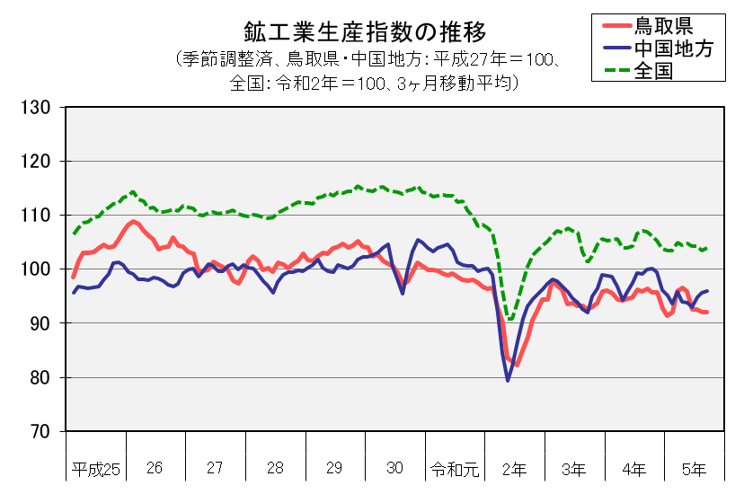 令和5年10月の鳥取県鉱工業指数(平成27年=100、季節調整済)は、生産指数が前月比4.7%の低下、出荷指数が前月比3.1%の低下、在庫指数が前月比3.1%の低下となった。生産、出荷、在庫の全ての指数は2か月連続で低下した。