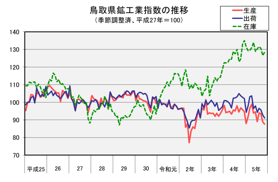 令和5年11月の鳥取県鉱工業指数(平成27年=100、季節調整済)は、生産指数が前月比1.6%の低下、出荷指数が前月比1.7%の低下、在庫指数が前月比1.6%の上昇となった。生産、出荷は3か月連続の低下、在庫は3か月ぶりに上昇した。