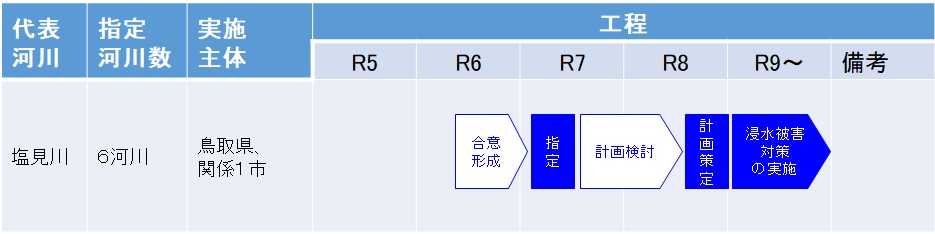 鳥取県の東部地区にある二級河川塩見川水系の流域は地形的特徴から浸水常襲地帯であり、昭和54年から浸水被害を防止・軽減するため堤防整備等の河川整備を進めていますが、令和5年7月豪雨では、整備計画規模を超える降雨であったものの、床上浸水13戸、床下浸水22戸が生じました。