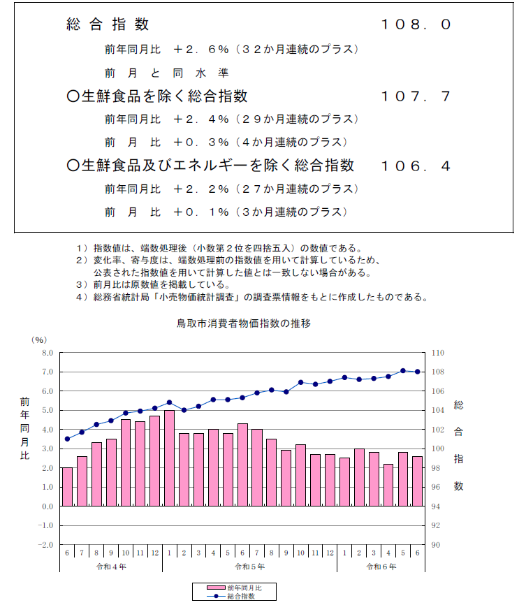 令和6年6月の鳥取市の消費者物価指数は、総合で108.0(2020年=100)となり、前年同月比は2.6%の上昇、前月比は同水準となった。