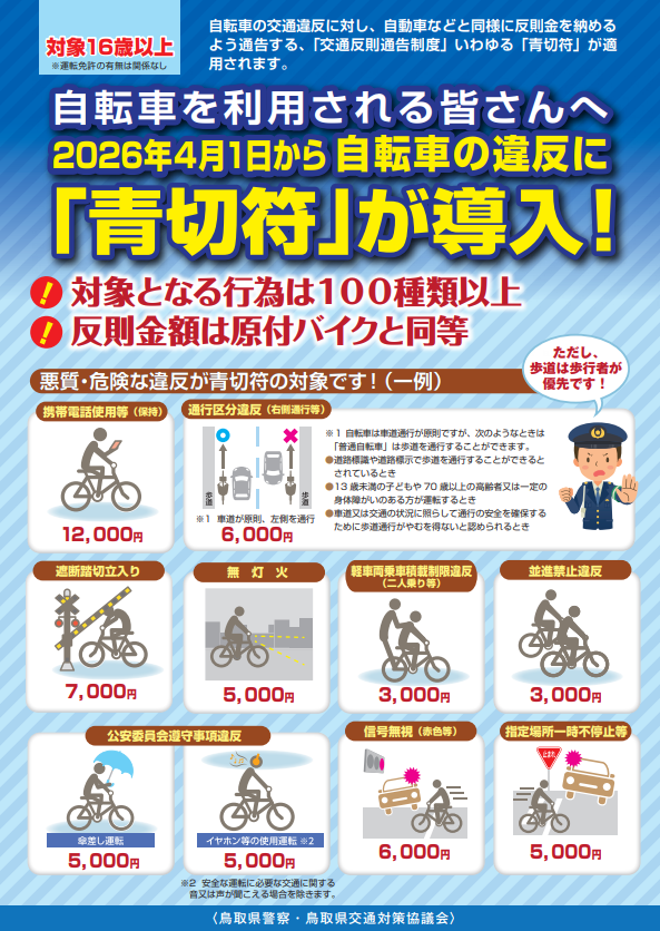 令和8年4月1日から、改正道路交通法が施行され、自転車の交通違反に交通反則通告制度(いわゆる「青切符」)が適用されます。