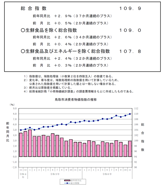令和6年11月の鳥取市の消費者物価指数は、総合で109.9(2020年=100)となり、前年同月比は2.9%の上昇、前月比は0.5%の上昇となった。