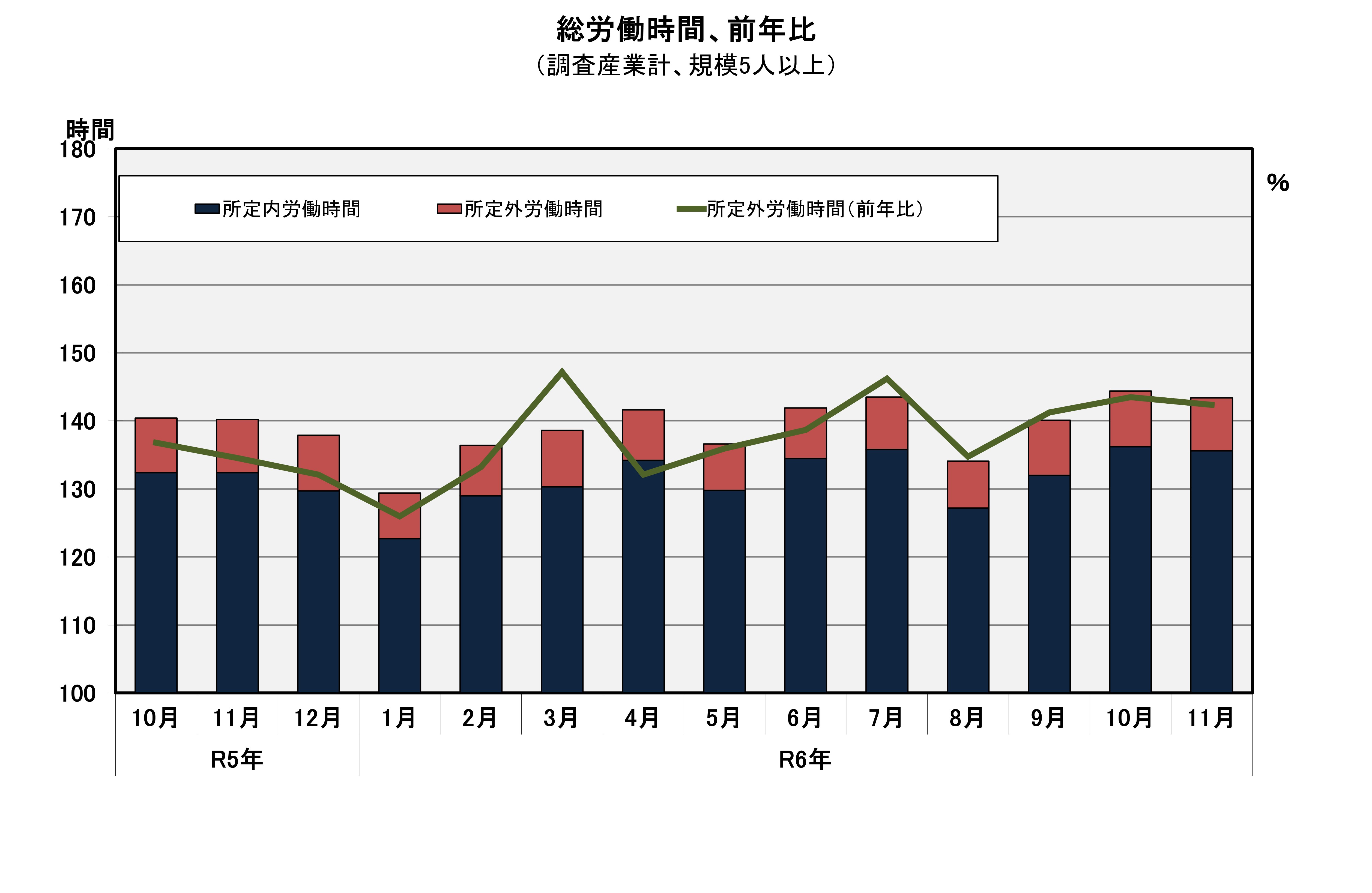 11月の総実労働時間は、規模5人以上で143.4時間となった。その労働時間指数は101.4で前年に比べ1.5%増(うち規模30人以上では148.2時間、その労働時間指数は101.8で前年に比べ1.7%増)となった。