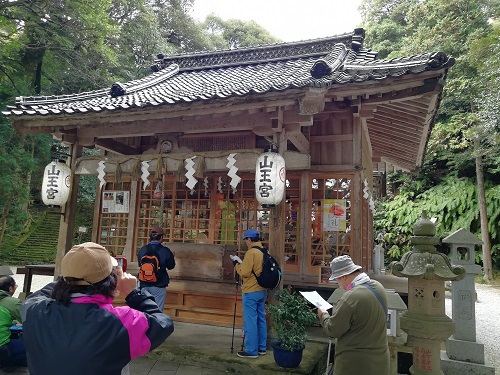 このような視点で今の風景を見ながら、布勢運動公園-ふれあい広場-日吉神社-布勢古墳-天神山城址-湖山池ナチュラルガーデン-布勢運動公園のコース、約4.8kmを巡りました。湖山池の地形や自然条件の変化が湖山池東岸の人々の暮らしに影響を与えたということに思いを馳せるハイキングで、参加者の方々も全員楽しみながら完歩しました。