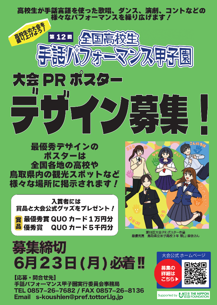 ・大会のキャッチコピー、手話シンボルマークは、デザインに入れないでください。(手話パフォーマンス甲子園実行委員会(以下「実行委員会」という。)で、ポスター加工の際に入れるため。)