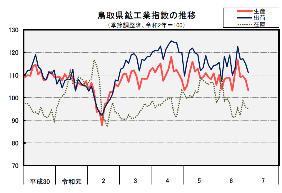 令和7年1月の鳥取県鉱工業指数(令和2年=100、季節調整済)は、生産指数が前月比4.4%の低下、出荷指数が前月比3.4%の低下、在庫指数が前月比0.8%の低下となった。生産、出荷、在庫いずれも2月連続で低下した。