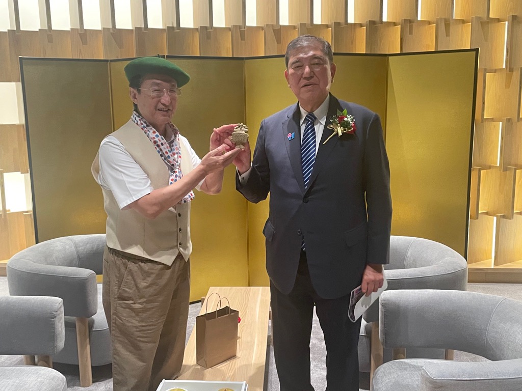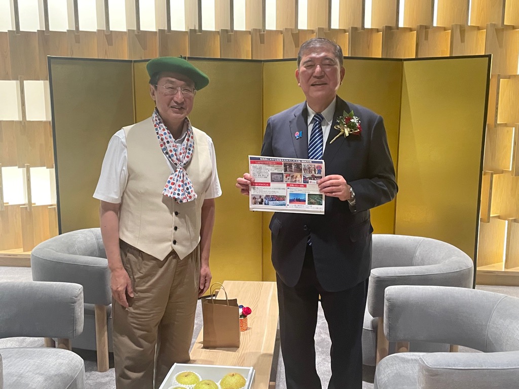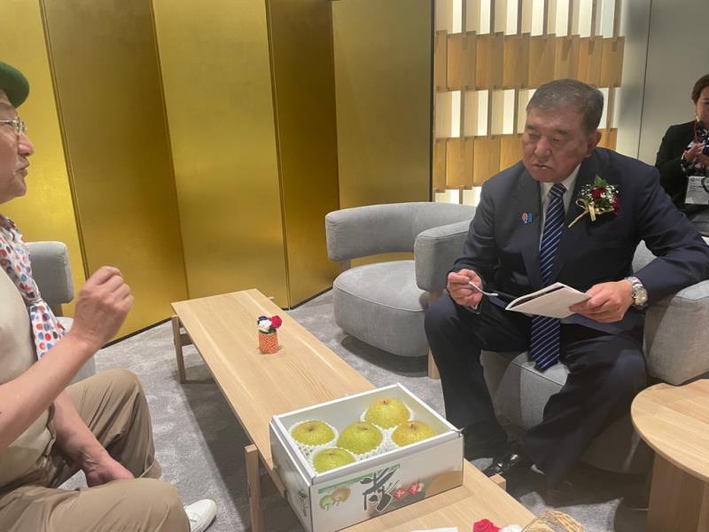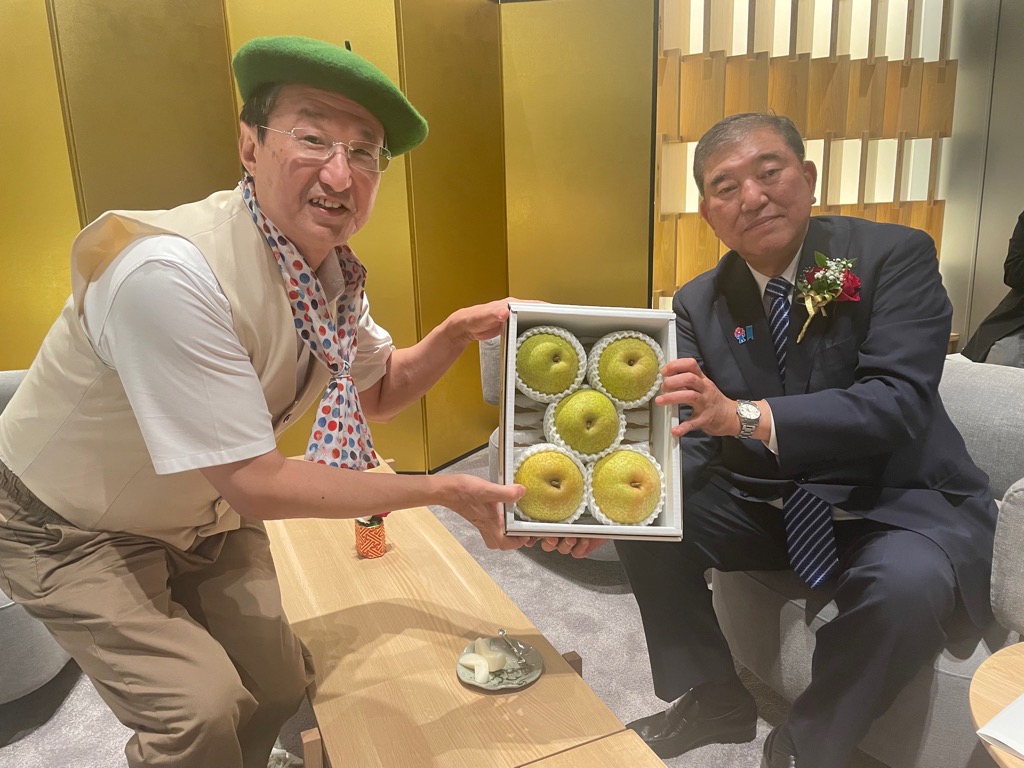 このたび、大阪・関西万博の閉幕にあたり、平井知事から石破茂総理大臣に万博開催に尽力されたことへの感謝の気持ちをお伝えするとともに、鳥取県育成ナシ新品種「鳥園L」をご紹介し、ご試食いただきました。下記のとおり石破総理との面談を行いました。