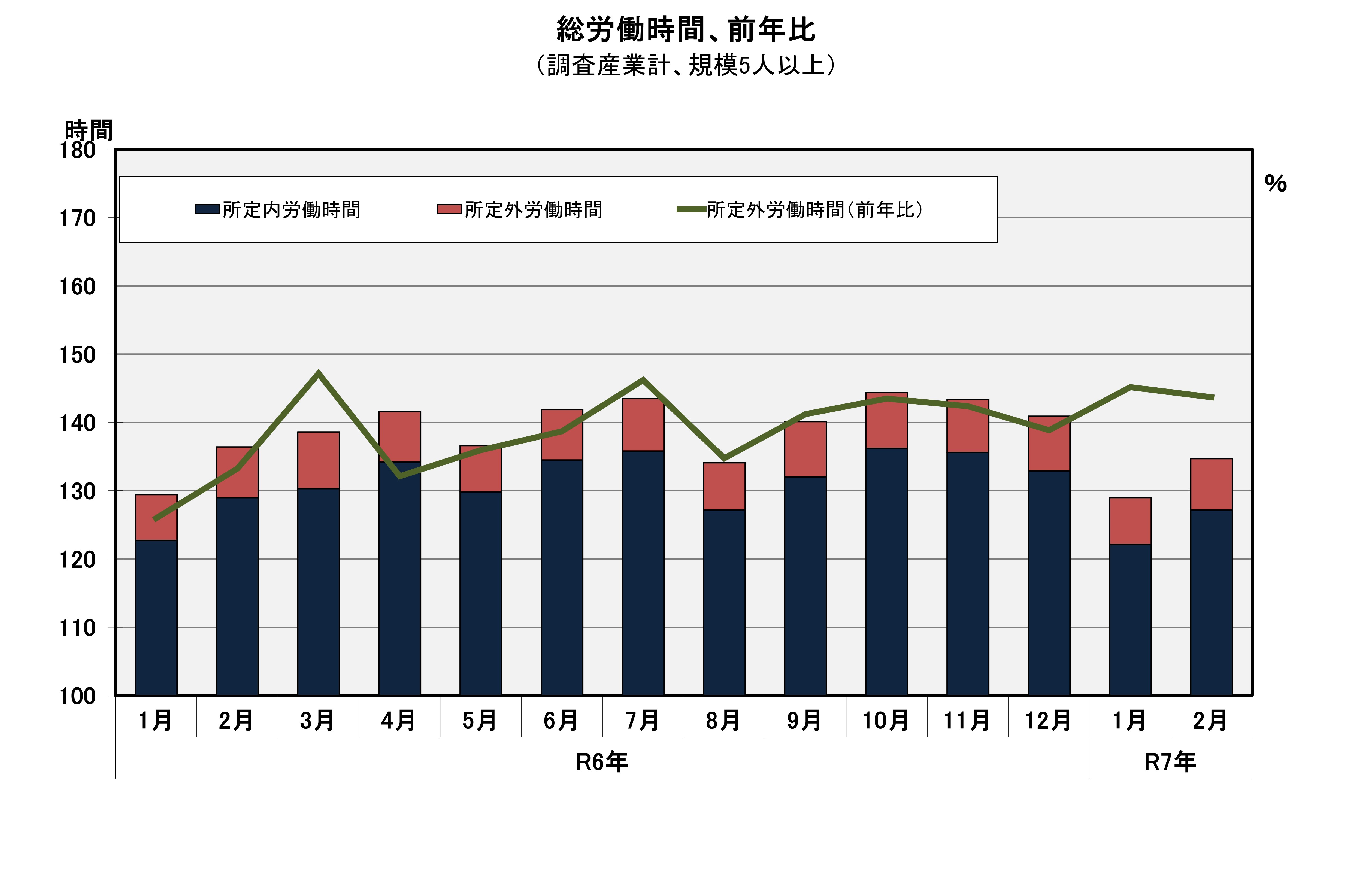 2月の総実労働時間は、規模5人以上で134.7時間となった。その労働時間指数は95.3で前年に比べ1.2%減(うち規模30人以上では137.8時間、その労働時間指数は94.6で前年に比べ4.3%減)となった。