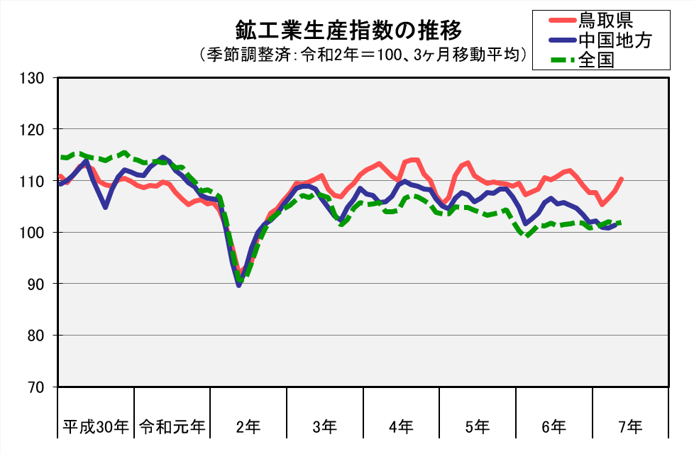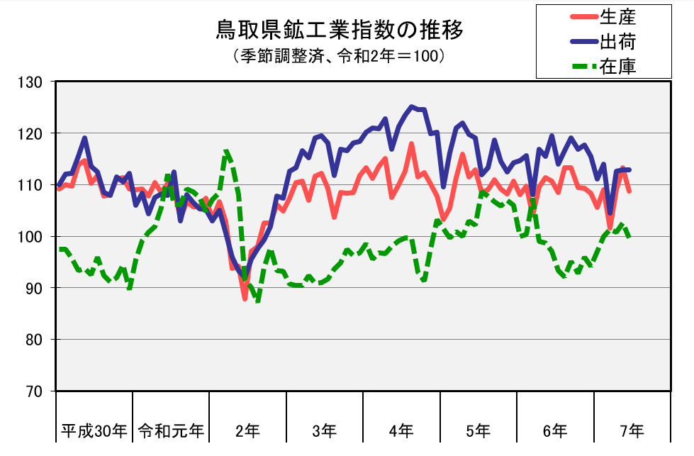 令和7年8月の鳥取県鉱工業指数(令和2年=100、季節調整済)は、生産指数が前月比2.9%の上昇、出荷指数が前月比0.9%の低下、在庫指数が前月比6.7%の低下となった。生産は3か月ぶりの上昇、出荷は2か月連続の低下、在庫は3か月連続で低下した。