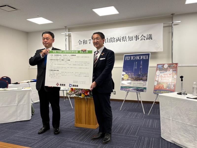鳥取・島根両県知事が共通する政策課題等について認識を深め、連携して対応していくための意見交換を行う山陰両県知事会議を開催しました。 広域観光連携の推進等をテーマに意見交換を行い、国内外から観光客を更に呼び込み、来訪者の満足度を高める取組を両県で進めることで合意しました。