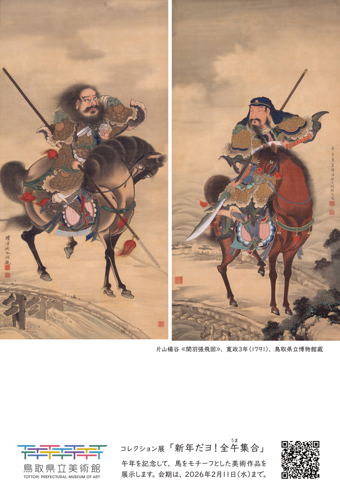 江戸時代後期に活躍した鳥取ゆかりの絵師、片山楊谷(かたやまようこく)の作品≪関羽張飛図≫。右側の関羽は、曹操と別れて劉備の元に戻る際、灞陵橋(はりょうばし)で曹操から餞別の錦の袍(ほう)をもらう有名な場面の前を。左側の張飛は、長坂橋で曹操軍と対峙した際、橋を落として相手を大喝する場面を描いています。