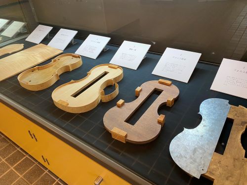 合掌造りを模した当館1階には、バイオリン製作に関する道具や木材、書籍に加え、製作過程も詳しく紹介されています。