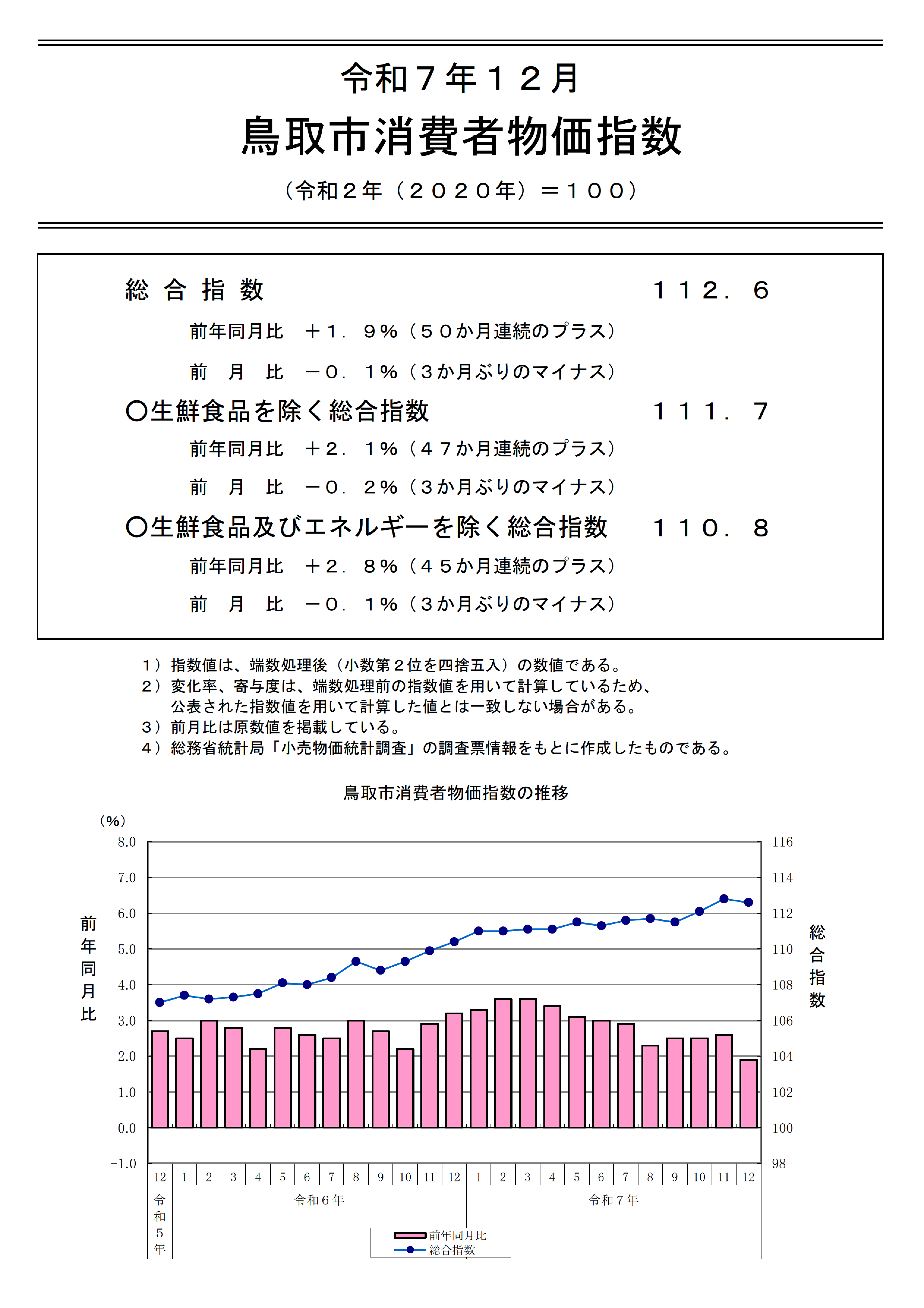 令和7年12月の鳥取市の消費者物価指数は、総合で112.6(2020年=100)となり、前年同月比は1.9%の上昇、前月比は0.1%の下落となった。