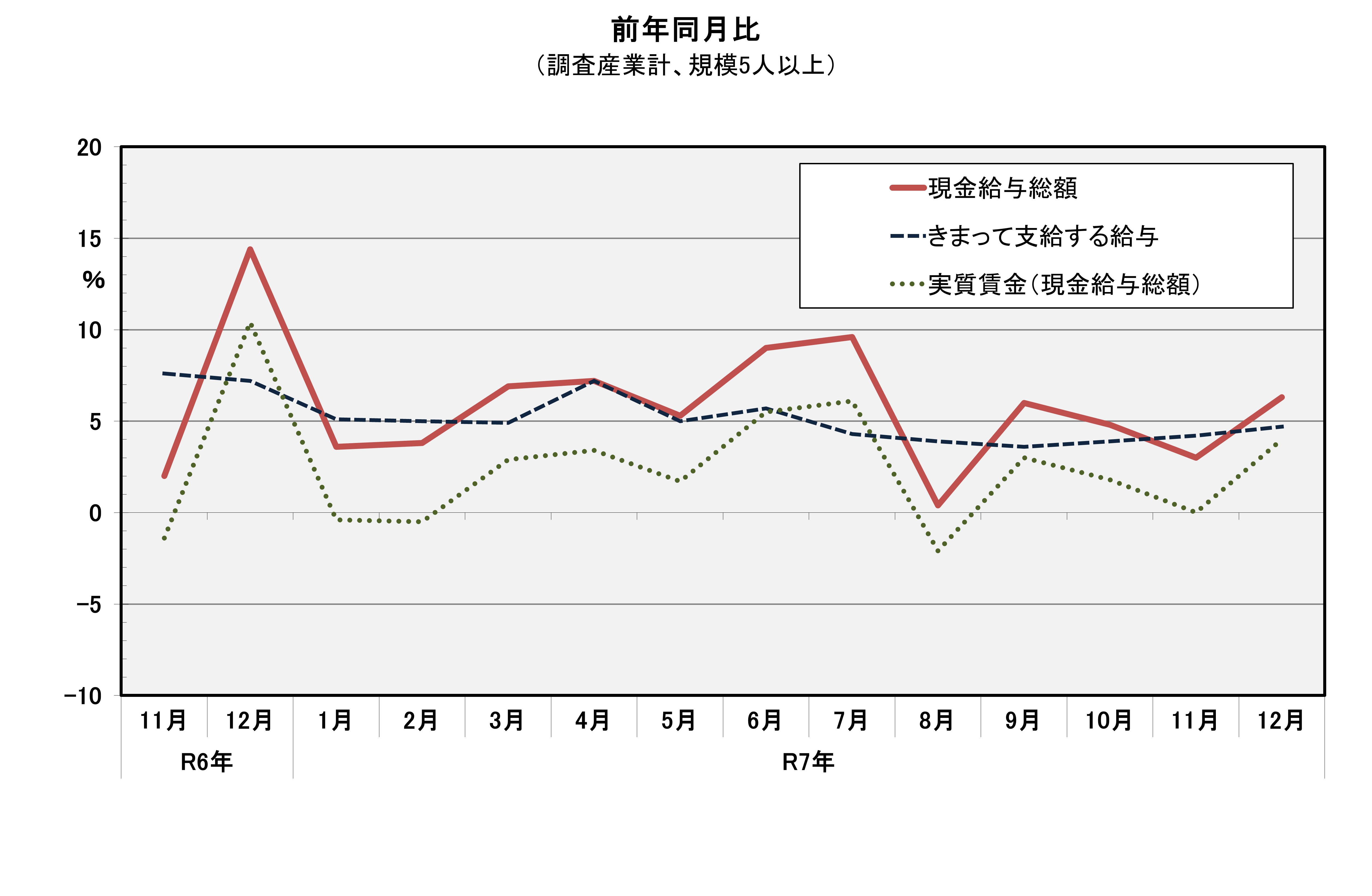 12月の現金給与総額は、規模5人以上で539,494円となった。その名目賃金指数は202.3で前年に比べ6.3%増(うち規模30人以上では571,944円、その名目賃金指数は193.2で前年に比べ3.6%増)となった。
