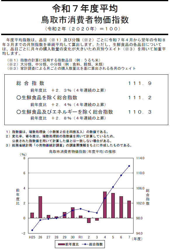 令和7年度平均の鳥取市の消費者物価指数は、総合で111.9(2020年=100)となり、前年度比は2.3%の上昇となった。