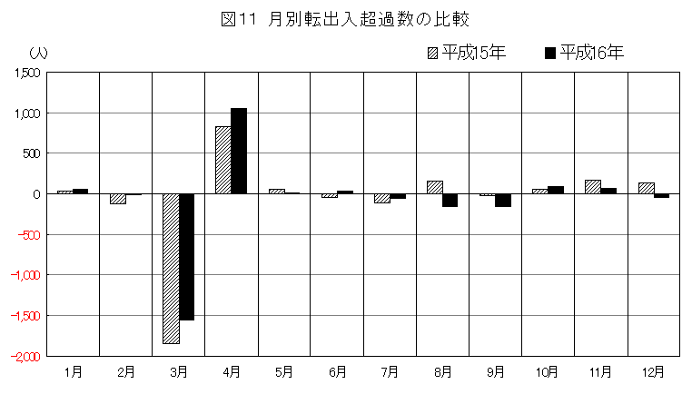 本県の月別人口(毎月1日現在)は、4月に大きく落ち込んだ後、5月~12月で緩やかに回復するパターンが見られるが、平成16年はこの回復が鈍くなる傾向が認められた。月別転入(出)超過の状況をみると、転出超過となったのは平成16年では2月、3月、7月、8月、9月、12月が転出超過となっている。年間でみも平成15年は733人の転出超過、平成16年は661人の転出超過となり3年連続の転出超過となった。