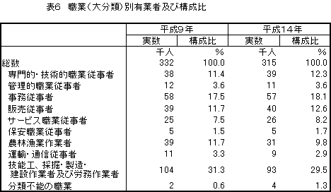 55歳以上の者の有業率をみると、「55~59歳」では、男性90.4%、女性63.4%、「60~64歳」では、男性65.1%、女性44.7%、「65~69歳」では、男性55.2%、女性34.8%、「70~74歳」では、男性39.0%、女性25.7%、「75歳以上」では、男性26.9%、女性10.1%となっている。 有業率を昭和54年以降の推移でみると、男性は昭和62年に各階級とも減少となり、その後増加傾向となってが、今回の調査では再び各階級が減少した。 女性は「65~69歳」は平成9年から引き続き減少している。その他の階級は平成9年は増加だったが、今回の調査では減少となった。