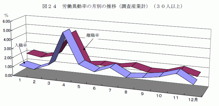 月別でみると、入職超過となったのは、新規採用の時期の4月のほか、5月、6月、7月、11月、12月であった。