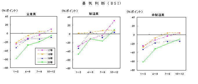 企業経営者の景気判断は、20年1~3月期は製造業、非製造業ともマイナスとなり、低調な見通しとなった。特に、非製造業の景気判断の悪化が目立っている。