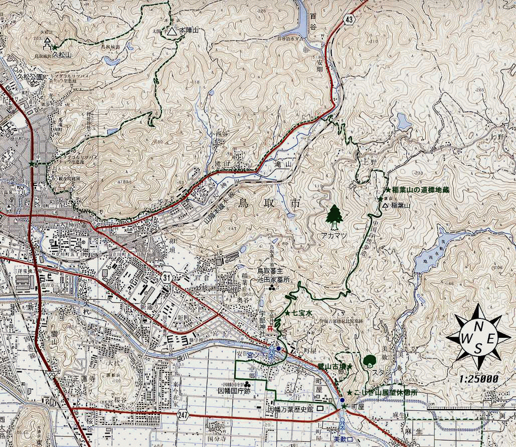 標高249mで、大小さまざまな古墳があります。因幡の国守であった在原行平(ありわちのゆきひら)がこの山を詠んだうたが百人一首にあります。