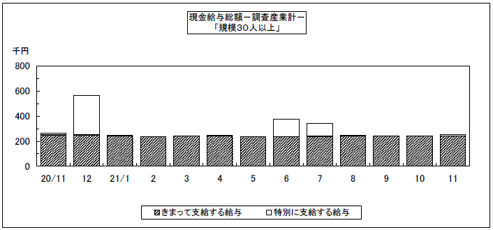 特別に支払われた給与は7,360円(規模30人以上では10,691円)であった。